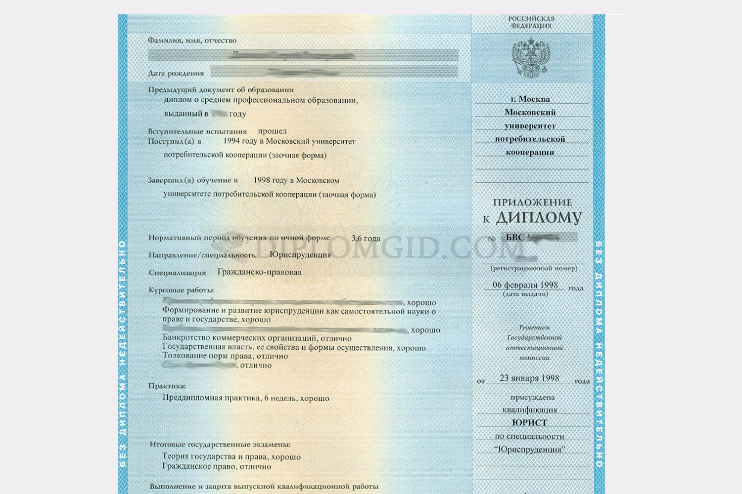 На нашем сайте Вы можете купить диплом с окончанием в 1997-2003 годах без обучения, выданный любым ВУЗом Москвы и других городов России. В комплект входит бланк, обложка и приложение, оформленные по всем стандартам.