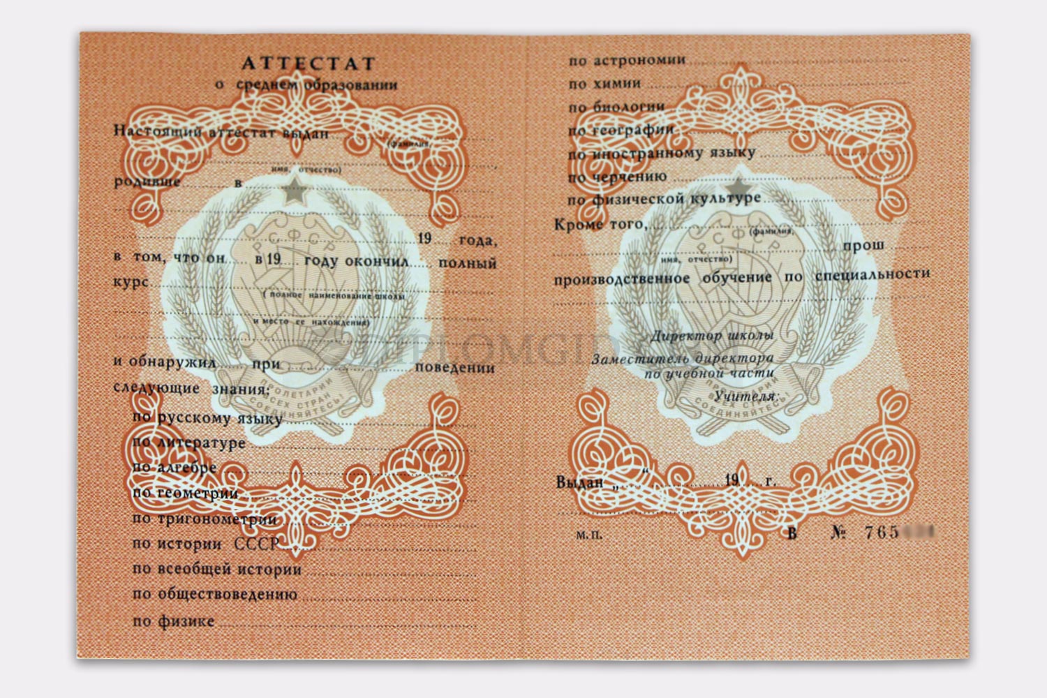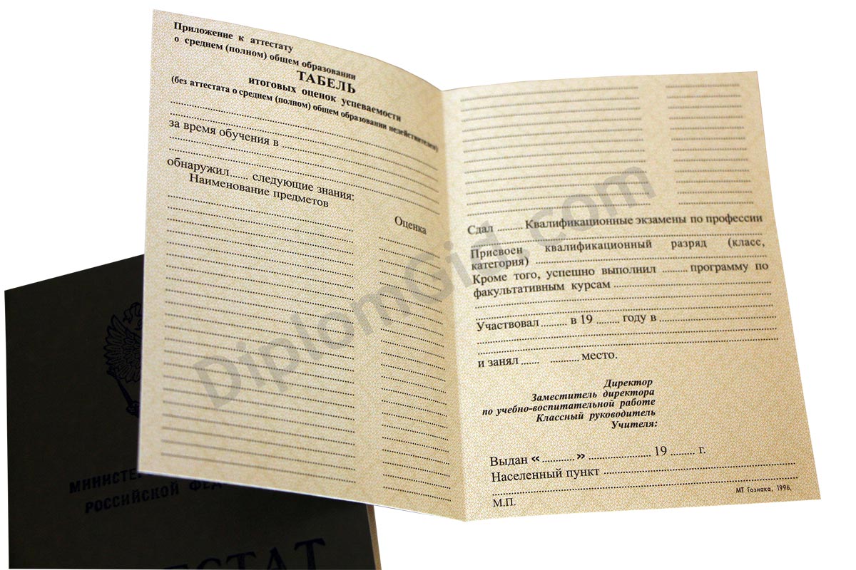 Аттестат школы об окончании 11 или 10 классов старого образца СССР с выдачей до 1994 года. Имеет советскую символику, заполняется по стандартам того времени, заверяется гербовой печатью РСФСР, подписью директора и других ответственных лиц. Аттестат как в школе!